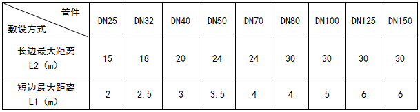 對(duì)于本文所述系統(tǒng)由固定點(diǎn)起,允許不裝補(bǔ)償器的直管段最大長(zhǎng)度民用建筑為33m,工業(yè)建筑為42m。(管道伸長(zhǎng)量分別為40mm和50mm)。實(shí)際設(shè)計(jì)時(shí)一般每段臂長(zhǎng)不大于20~30m,不小于2m。在自然補(bǔ)償兩臂頂端設(shè)置固定支架。“г”型補(bǔ)償器一般用于DN150以下管道;最大允許距離與管徑關(guān)系見表1。“Z” 型補(bǔ)償器可以看做兩個(gè)“г”型補(bǔ)償器。