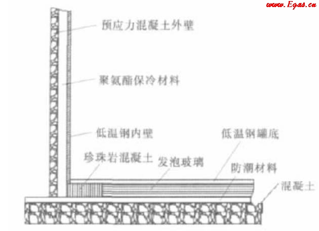 內(nèi)罐壁要求耐低溫,一般選用9Ni鋼或鋁合金等材料,外罐壁為預(yù)應(yīng)力鋼筋混凝土。