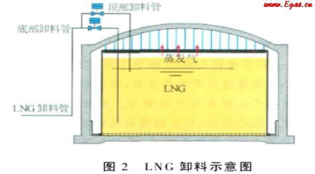 卸船時,當船上的LNG密度比儲罐內(nèi)LNG密度重時,從頂部卸料管進罐。反之,從底部卸料管進罐,這樣可以促進不同密度的LNG在儲罐內(nèi)自行混合,消除分層。