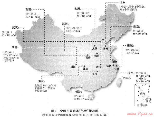 2009年11月,隨著大范圍雨雪天氣的來臨,中國(guó)許多地區(qū)出現(xiàn)了“氣荒”——天然氣供應(yīng)緊張的局面。過去幾年間,也出現(xiàn)過天然氣供應(yīng)緊張現(xiàn)象,但像今年如此大規(guī)模天然氣供應(yīng)缺口,還是首次。