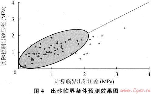 對澀北一號氣田48口井的出砂臨界壓差進行了計算。對比實際出砂壓差與預(yù)測結(jié)果,大部分數(shù)值比較接近(圖4)。說明該出砂臨界條件計算模型是可靠的,可滿足生產(chǎn)設(shè)計的需要。