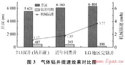 近兩年在15個(gè)構(gòu)造上累計(jì)實(shí)施氣體鉆井技術(shù)提速69口井、131井次,平均機(jī)械鉆速為12.73m/h,平均機(jī)械鉆速提高2~14倍。LG地區(qū)陸續(xù)開展44口井96井次的氣體鉆井作業(yè),總進(jìn)尺為122318m,占LG地區(qū)鉆井總進(jìn)尺的48.96%。LG地區(qū)已完鉆的25口井平均井深為6404m,平均鉆井周期為190d,氣體鉆井平均進(jìn)尺比例為46.3%,完鉆井平均機(jī)械鉆速為3.77m/h,平均月速度為1012m/臺(tái)月。氣體鉆井技術(shù)的應(yīng)用使超深井鉆井能力得到極大提升,超深井鉆井速度實(shí)現(xiàn)重大突破,與近年同類井(6000m以上氣體鉆超深井七北101、黃金1、東升1等井)及近年常規(guī)鉆井液鉆超深井相比,技術(shù)指標(biāo)大幅提高(圖3)。
