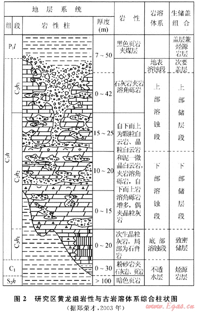 位于四川盆地東部的渝北-鄰水地區(qū)在范圍上包括重慶市的渝北區(qū)、北碚區(qū)和四川省的鄰水縣與華鎣山市,面積約3900km2(圖1)。上石炭統(tǒng)黃龍組為該地區(qū)天然氣主要產(chǎn)層,儲層屬于古巖溶成因類型[5~7],區(qū)內(nèi)發(fā)育有鄰北、板東、板橋、座洞崖、銅鑼峽、相國寺和環(huán)山等眾多次一級構(gòu)造控制的黃龍組氣藏,具備很大的勘探開發(fā)潛力。研究區(qū)石炭系受海西早期強烈構(gòu)造隆封和侵蝕作用,只殘存了不完整的上石炭統(tǒng)黃龍組拱不整合超覆在中志留統(tǒng)韓家店組暗色泥頁巖之上,頂面被下二疊統(tǒng)梁山組煤系地層超覆,自下而上被劃分為3個巖性和巖相截然不同的巖性段[8](圖2)。