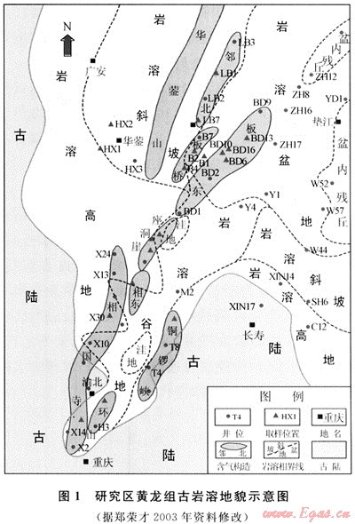 碳酸鹽礦物鍶同位素地球化學特征是碳酸鹽巖成因分析最重要的證據(jù)之一[1~2],近年來國外將鍶同位素地球化學特征廣泛地應用于碳酸鹽巖石學、巖相古地理和儲層地質(zhì)學等研究領域中,而將其應用到碳酸鹽巖古巖溶儲層中的成果則很少[3~4]。筆者僅就渝北-鄰水地區(qū)上石炭統(tǒng)黃龍組古巖溶儲層的鍶同位素特征對巖溶過程的流體性質(zhì)和古水文條件展開討論,為預測和評價此類儲層提供有關(guān)的地質(zhì)-地球化學信息。