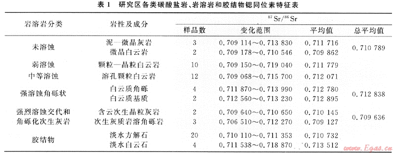 包括未溶蝕的正常海相泥-微晶灰?guī)r和薩勃哈環(huán)境的微晶白云巖,此兩類樣品的分析結(jié)果,主要用作為代表地層鍶同位素背景值和描述與對比巖溶巖系溶蝕過程中鍶同位素變化規(guī)律的參照物。