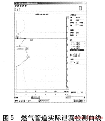 2004年元月2日,對(duì)呼和浩特市新建西街的燃?xì)夤芫W(wǎng)進(jìn)行檢漏,當(dāng)車行駛在新建西街上,報(bào)警聲響起,電腦屏幕立即顯示,發(fā)現(xiàn)了有燃?xì)庑孤┑牡胤?。圖4是燃?xì)夤艿缹?shí)際泄漏檢測(cè)數(shù)據(jù)表。為了真實(shí)還原這次燃?xì)庑孤z查的全過(guò)程,從實(shí)際記錄的預(yù)覽檢測(cè)圖中,可以看到該次檢測(cè)的檢測(cè)結(jié)果和其他信息。圖5是燃?xì)夤艿缹?shí)際泄漏檢測(cè)曲線。