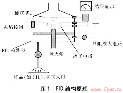 Harley等人于1958年研制成功氫火焰離子化檢測(cè)器(Hydrogen Flame Ionization Detector,F(xiàn)ID)[2]。它的基本原理是以氫氣和氮?dú)獾幕旌蠚庠诳諝庵腥紵傻幕鹧鏋槟茉?,?dāng)碳?xì)溆袡C(jī)化合物進(jìn)入氫氣和氧氣燃燒室的火焰中時(shí),在高溫的作用下,產(chǎn)生化學(xué)電離反應(yīng),電離產(chǎn)生比基流高幾個(gè)數(shù)量級(jí)的離子,在較高直流電場(chǎng)的定向作用下,形成離子流,微弱的離子流(10-12~10-8A)產(chǎn)生與進(jìn)入火焰的碳?xì)溆袡C(jī)化合物量成正比的電流信號(hào),因而電流信號(hào)與被測(cè)碳?xì)溆袡C(jī)化合物(如甲烷CH4)的體積分?jǐn)?shù)成正比,體積分?jǐn)?shù)為1×10-6所對(duì)應(yīng)的電流約為500fA。經(jīng)過(guò)高阻電路(電阻為106~1011Ω)放大后形成電壓信號(hào),此電壓能換算成被測(cè)氣體的體積分?jǐn)?shù)。FID結(jié)構(gòu)原理見(jiàn)圖1。
