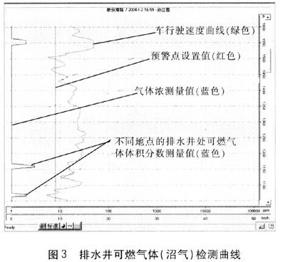 采用車載FID檢測(cè)系統(tǒng)對(duì)排水井可燃?xì)怏w(沼氣)檢測(cè)曲線見(jiàn)圖3。