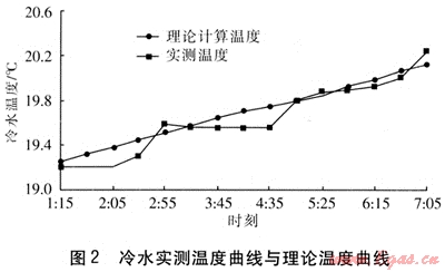 某日冷水機組關(guān)機后,不同時刻冷水實測溫度與由式(5)計算得到的理論溫度的比較見圖2。由圖2可知,實測溫度與由式(5)計算得到的理論溫度吻合較好,因此可采用式(5)計算停機后某時刻冷水溫度。