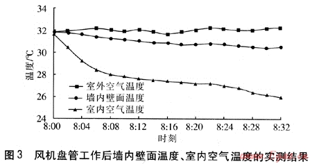2006年8月7日對風(fēng)機盤管工作后墻內(nèi)壁面溫度、室內(nèi)空氣溫度的實測結(jié)果見圖3。由圖3可知,墻內(nèi)壁面實測初始溫度為31.8℃,實測室內(nèi)初始空氣溫度為31.6℃。隨著風(fēng)機盤管的開啟,墻內(nèi)壁面溫度平緩下降,30min后降至30.5℃,由于時間較短,可以近似認為墻內(nèi)壁面溫度保持不變。風(fēng)機盤管工作30min后,室內(nèi)空氣溫度由31.6℃降至26℃,風(fēng)機盤管工作時間與計算結(jié)果(18~23min)相差不大。