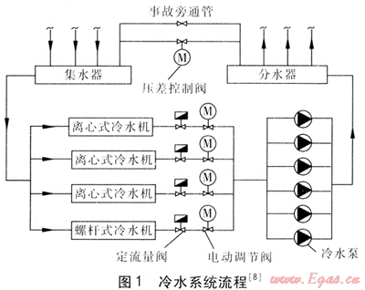 為了保證在部分負荷時冷水機組的高效運行,選用3臺離心式冷水機與1臺螺桿式冷水機,在過渡季節(jié)或負荷較小時,只開啟螺桿式冷水機。冷水機進出水溫度為13、7℃,冷水機與附屬設(shè)備見表1[8]??照{(diào)水系統(tǒng)為一次泵、末端變流量、機組側(cè)定流量系統(tǒng),采用二管制,豎向不分區(qū),末端空調(diào)裝置采用風(fēng)機盤管,冷水系統(tǒng)流程見圖1㈨。