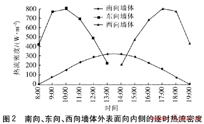 墻體內(nèi)外側(cè)表面?zhèn)鳠嵯禂?shù)分別取8.7、23.3W/(m2·K),根據(jù)文獻(xiàn)[7]提供的圍護(hù)結(jié)構(gòu)基本耗熱量及圍護(hù)結(jié)構(gòu)傳熱系數(shù)計(jì)算式,計(jì)算得出圍護(hù)結(jié)構(gòu)傳熱系數(shù)為0.3W/(m2·K)。若室內(nèi)溫度保持18℃,根據(jù)傳統(tǒng)墻體供暖熱負(fù)荷計(jì)算方法,得到單位面積基本耗熱量為17.7W/m2。由圖2可知,除了南向墻體8:00、19:00兩個(gè)時(shí)刻熱流密度小于17.7W/m2外,其余時(shí)刻在太陽(yáng)輻射條件下3個(gè)朝向墻體外表面向內(nèi)側(cè)的熱流密度均遠(yuǎn)高于單位面積基本耗熱量。因此,在實(shí)際設(shè)計(jì)及運(yùn)行中,應(yīng)根據(jù)建筑墻體朝向及太陽(yáng)輻射情況,采用合理的供暖系統(tǒng)運(yùn)行方案,這樣既能滿(mǎn)足供熱要求,又能合理地使用能源,降低運(yùn)行成本。