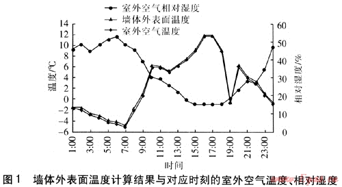 為了對(duì)太陽(yáng)輻射條件下墻體外表面向內(nèi)側(cè)的傳熱量進(jìn)行分析,選定墻體結(jié)構(gòu)及材料熱工性能參數(shù)見(jiàn)表1,熱工性能參數(shù)滿(mǎn)足DB 63/643—2007《青海省居住建筑節(jié)能設(shè)計(jì)標(biāo)準(zhǔn)》。墻體外表面為淺色涂料,建筑物四周為綠色草坪。墻體外表面溫度采用有限差分法進(jìn)行計(jì)算,并采用ANSYS計(jì)算軟件對(duì)結(jié)果進(jìn)行校核。墻體外表面溫度計(jì)算結(jié)果與對(duì)應(yīng)時(shí)刻的室外空氣溫度、相對(duì)濕度見(jiàn)圖1。