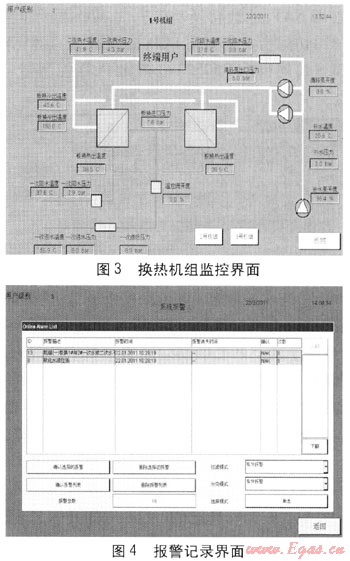 某城市集中供熱工程包括40座熱力站,項(xiàng)目規(guī)劃供熱面積為350×104m2。該項(xiàng)目分兩期建設(shè),一期工程于2009年4月開工建設(shè),已完成11座熱力站的安裝調(diào)試。熱力站控制器采用了具有嵌入式Web服務(wù)器功能的SAIA PCD系列控制器。換熱機(jī)組監(jiān)控界面、報(bào)警記錄界面分別見圖3、4。