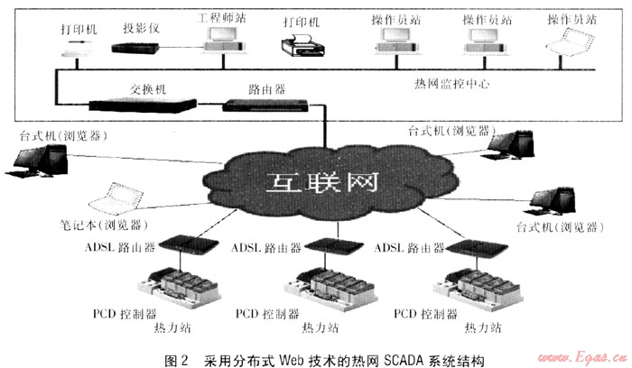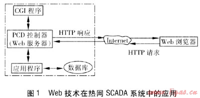 實(shí)現(xiàn)分布式Web技術(shù)熱網(wǎng)SCADA系統(tǒng)的前提條件就是必須采用嵌入Web服務(wù)器功能的PCD控制器。PCD控制器將采集到的熱網(wǎng)信息及時(shí)發(fā)布到Internet上去,熱力站的運(yùn)行管理人員可以隨時(shí)隨地用Web瀏覽器進(jìn)行遠(yuǎn)程訪問,獲取最新的熱力站現(xiàn)場(chǎng)運(yùn)行信息,實(shí)現(xiàn)對(duì)熱網(wǎng)實(shí)時(shí)有效的遠(yuǎn)程監(jiān)控和集中管理。因此,采用分布式Web技術(shù)的熱網(wǎng)SCADA系統(tǒng)是今后的發(fā)展方向。