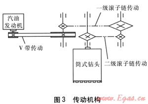 傳動機(jī)構(gòu)采用V帶傳動和兩級滾子鏈傳動,通過多級減速傳動輸出,帶動筒式鉆頭旋轉(zhuǎn)切割,傳動機(jī)構(gòu)見圖3。