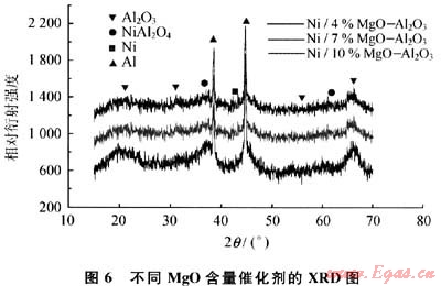 圖6為不同MgO含量的載體催化劑的XRD譜圖,通過與標(biāo)準(zhǔn)譜圖對(duì)比可以看出,在2口為36°和62°兩處出現(xiàn)NiAl2O4尖晶石的衍射峰,4%MgO-Al203載體曲線中NiAl2O4的衍射峰很弱,但隨著MgO加入量的增加,NiAl2O4的衍射峰逐漸增強(qiáng),說明Ni與Al2O3的相互作用增強(qiáng),活性中心Ni逐漸減少,而且4%MgO-Al203載體的曲線比較散漫,表明粒徑分布較為均勻,使得催化活性較好。
