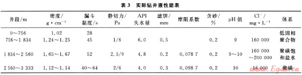 直井段采用低固相聚合物體系,膏鹽層段采用聚磺欠飽和一飽和鹽水體系,第3次開鉆井段采用聚磺體系。由于鹽層中高壓鹽水的存在,其存在又無規(guī)律,鹽水浸入又易導(dǎo)致鹽析發(fā)生卡鉆事故,現(xiàn)場試驗地層破裂壓力系數(shù)在1.9g/cm3以上。因此,該井膏鹽層使用了比直井更高的鉆井液密度,目的是防止斜井段高壓鹽水浸和鹽層蠕動變形。在膏鹽層段主要要提高鉆井液的潤滑性,防止阻卡及降低鉆井液的流動阻力,提高鉆井液的抗污染能力。有效避免鹽膏層的溶解、污染、縮徑、大井徑、井塌等一系列井下復(fù)雜和事故的發(fā)生,實際鉆井液性能,見表3。