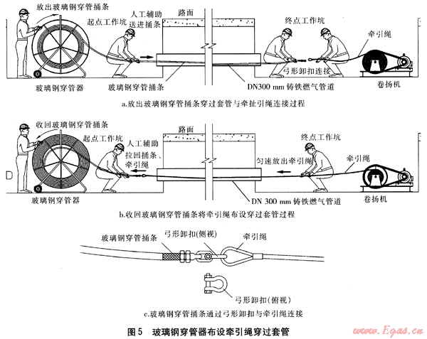 以下介紹以卷揚機作為機械牽引動力、以廢舊的DN 300mm鑄鐵燃氣管道作為套管、以NOD 200mm的PE燃氣管道進行穿插套管的施工技術(shù)。