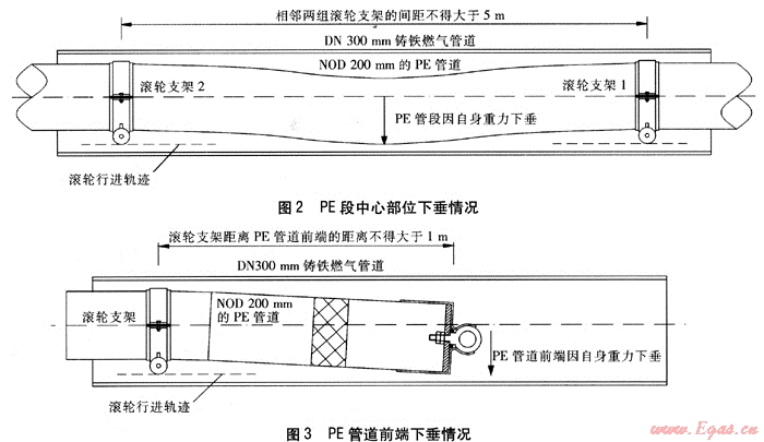 Key words:gas pipeline repair;east iron pipe;PE pipe;roller bracket;insertion