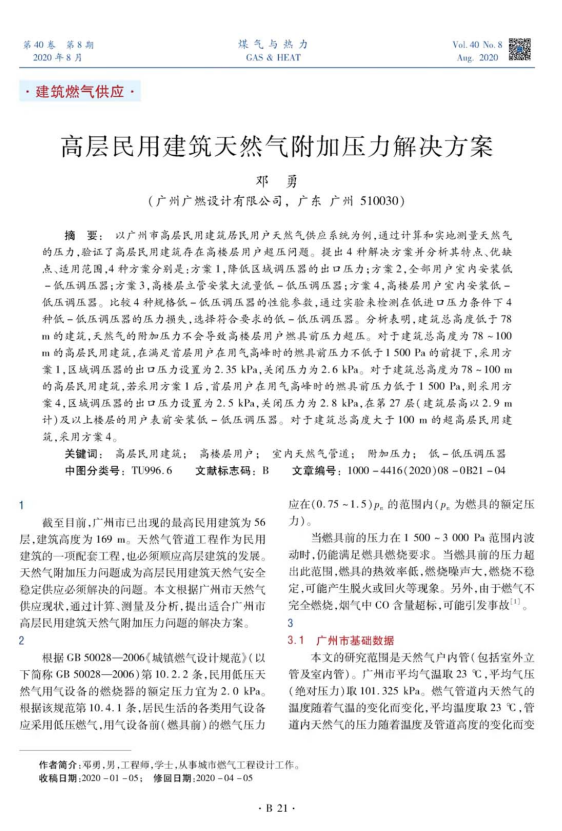 上述為廣州市高層民用建筑居民用戶天然氣供應(yīng)系統(tǒng)為例,通過(guò)計(jì)算和實(shí)地測(cè)量天然氣的壓力,驗(yàn)證了高層民用建筑存在高樓層用戶超壓?jiǎn)栴}。提出4種解決方案并分析其特點(diǎn)、優(yōu)缺點(diǎn)、適用范圍。