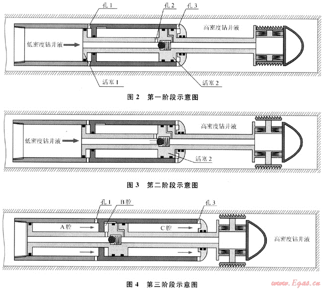 1) 對套管內(nèi)的低密度鉆井液加壓,活塞桿右行。如圖2所示,對套管內(nèi)的低密度鉆井液施壓,低密度鉆井液所產(chǎn)生的壓力和泵壓共同作用在活塞1的左側(cè)面上,同時(shí)通過活塞桿上的通道和孔2作用在活塞2的左側(cè)面上,共同產(chǎn)生向右的推力,克服高密度鉆井液作用在活塞1、2右側(cè)面上的阻力和密封摩擦阻力,推動活塞和卡盤向右運(yùn)動。