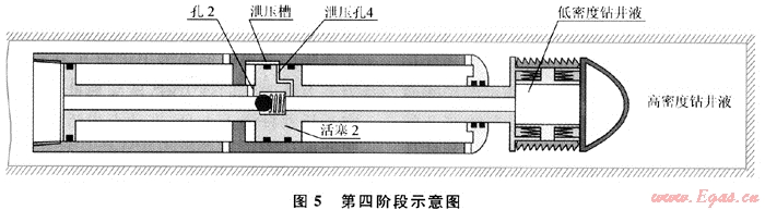 4) 泄壓孔與泄壓槽相連通,卡齒泄壓縮回。如圖5所示,當(dāng)隔板接近活塞2時(shí),活塞2上的泄壓孔4與活塞缸上的泄壓槽連通,活塞桿右段及卡盤內(nèi)的低密度鉆井液經(jīng)泄壓孔4、泄壓槽、孔2、活塞桿左段的內(nèi)孔與套管內(nèi)的低密度鉆井液連通而泄壓,卡齒受到碟簧的彈力而收回,整個水平井套管牽引工具回復(fù)到初始狀態(tài)。