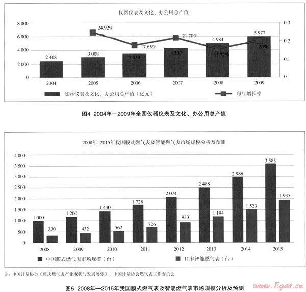近幾年,我國儀器儀表及文化、辦公用行業(yè)發(fā)展迅速,2009年我國儀器儀表及文化、辦公用總產(chǎn)值達(dá)到5977億元。根據(jù)第5次全國人口普查數(shù)據(jù),我國共有家庭3.48億戶,城鎮(zhèn)人口約占總?cè)丝诘?5.68%,因此推算我國城鎮(zhèn)家庭約有1.58億戶。靜態(tài)地估計,國內(nèi)民用燃?xì)獗淼氖袌鋈萘考s為1.5億臺,目前我國處于傳統(tǒng)燃?xì)獗硐蛑悄苋細(xì)獗淼霓D(zhuǎn)換階段,IC卡燃?xì)獗?、無線燃?xì)獗砗虶PRS遠(yuǎn)程燃?xì)獗O(jiān)控抄表系統(tǒng)將成為主要產(chǎn)品。根據(jù)國家計量檢定規(guī)程~JJG577—2005《膜式燃?xì)獗怼芬?guī)定:以天然氣為介質(zhì)的燃?xì)獗硎褂闷谙抟话悴怀^10年,以人工燃?xì)?、液化石油氣等為介質(zhì)的燃?xì)獗硎褂闷谙抟话悴怀^6年。因此燃?xì)獗?/span>行業(yè)是一個持續(xù)發(fā)展的行業(yè),未來的市場前景廣闊。保守的估計,2008年以后國內(nèi)每年更新或新安裝的燃?xì)獗?000萬臺以上,其中智能燃?xì)獗碚嫉?0%以上。預(yù)計2010年以后國內(nèi)市場對燃?xì)獗淼哪晷枨罅靠蛇_(dá)1500萬臺以上,其中智能燃?xì)獗韺⒄伎傂枨蟮?0%左右,而且需求量呈逐年上升的趨勢,每年的增長率可達(dá)30%~35%。到2015年中國燃?xì)獗淼目傂枨罅靠蛇_(dá)到3500萬臺~3700萬臺左右,其中智能燃?xì)獗砑s占總需求量的50%~55%左右。本公司產(chǎn)品自1998年投放市場以來,大量的在線產(chǎn)品已經(jīng)進(jìn)入更換期,因此在未來智能燃?xì)獗砀鼡Q市場中將釋放出巨大的市場潛力。
