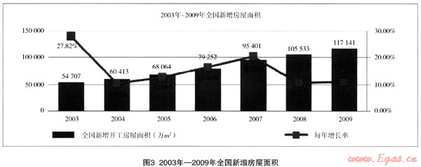 燃?xì)獗順I(yè)務(wù)與房產(chǎn)市場發(fā)展密切相關(guān)。2003年—2009年建筑房屋施工面積由259377萬m2增加到588593萬m2,年均增長14.6%。