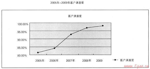 (2) 重慶燃?xì)饧瘓F(tuán)按照客戶滿意度測評表的項目和內(nèi)容進(jìn)行客戶滿意度測評,測評數(shù)據(jù)均由客服系統(tǒng)自動生成。2005年-2009年客戶滿意度分別為:81.8%、84.3%、93%、97%、98.18%。