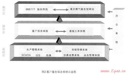 重慶燃?xì)饧瘓F(tuán)充分利用現(xiàn)代計算機(jī)和通訊技術(shù),創(chuàng)建了先進(jìn)的客戶服務(wù)信息系統(tǒng),包括生產(chǎn)管理、營銷管理、客戶資料、客戶服務(wù)工單、966777服務(wù)熱線五個方面,整個系統(tǒng)資源共享、無縫銜接,為客戶提供精細(xì)服務(wù)。服務(wù)流程是客戶服務(wù)工作的導(dǎo)向,為保證服務(wù)流程的統(tǒng)一,集團(tuán)公司通過建設(shè)客戶服務(wù)信息系統(tǒng),對服務(wù)流程進(jìn)行優(yōu)化,并在信息系統(tǒng)中對關(guān)鍵流程進(jìn)行固化。見圖2: