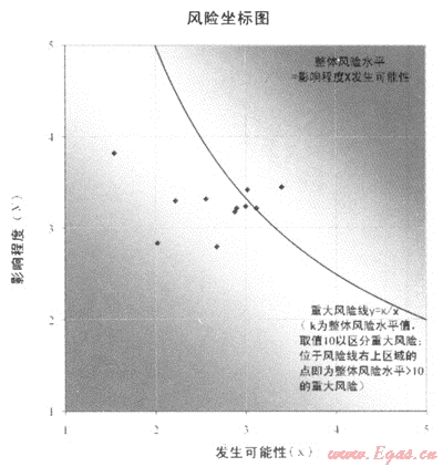 風(fēng)險(xiǎn)坐標(biāo)圖法就是把風(fēng)險(xiǎn)發(fā)生可能性的高低、風(fēng)險(xiǎn)發(fā)生后對(duì)目標(biāo)的影響程度,作為兩個(gè)維度繪制在同一個(gè)平面上(即繪制成直角坐標(biāo)系)。對(duì)風(fēng)險(xiǎn)發(fā)生可能性的高低、風(fēng)險(xiǎn)對(duì)目標(biāo)影響程度的評(píng)估又分為定性、定量等方法。定性方法相對(duì)比較簡(jiǎn)單,可以直接運(yùn)用定性術(shù)語(yǔ)描述發(fā)生的可能性的高低以及對(duì)目標(biāo)影響程度。如“極低”、“低”、“中等”、“高”、“極高”等。定量方法是對(duì)風(fēng)險(xiǎn)發(fā)生可能性的高低、風(fēng)險(xiǎn)對(duì)目標(biāo)影響程度用具有實(shí)際意義的數(shù)量描述,如對(duì)風(fēng)險(xiǎn)發(fā)生可能性的高低用概率來(lái)表示,對(duì)目標(biāo)影響程度用損失金額來(lái)表示。深圳燃?xì)獠扇〉亩亢投ㄐ韵嘟Y(jié)合的坐標(biāo)圖法評(píng)估出的重大風(fēng)險(xiǎn)。