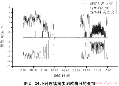 表1為深南-科苑立交、沙河立交、白石洲管地電位24小時(shí)連續(xù)同步測試數(shù)據(jù),圖2為上述測試點(diǎn)的24小時(shí)連續(xù)同步測試曲線的疊加。