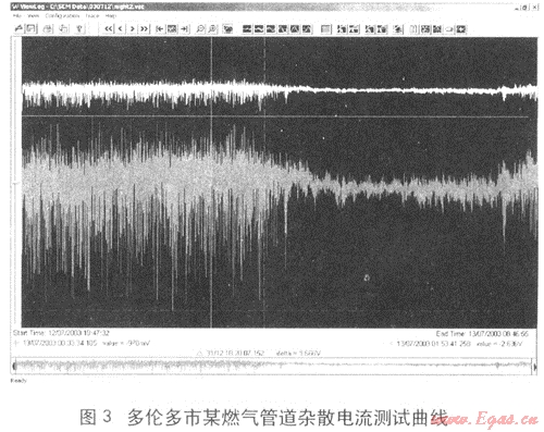 美國腐蝕工程師學(xué)會(huì)(NACE)在2004年發(fā)布了一篇報(bào)告《對影響管道的雜散電流的一種測試技術(shù)》,報(bào)告中提出可以采用SCM測試儀等方法對影響管道的雜散電流進(jìn)行測試,并以加拿大多倫多市的一條燃?xì)夤芫€的測試數(shù)據(jù)為例進(jìn)行分析,詳見圖3。測試數(shù)據(jù)顯示,燃?xì)夤艿朗艿诫s散電流干擾,報(bào)告中分析干擾信號與附近電氣化鐵路的運(yùn)行有關(guān),應(yīng)該是來源于鐵路的運(yùn)行。