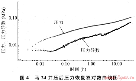 在馬24井為代表的壓后壓力雙對數(shù)曲線上,壓力與壓力導(dǎo)數(shù)成鐵軌狀,水力裂縫特征明顯,說明壓后在地層中形成了主裂縫(圖4)。