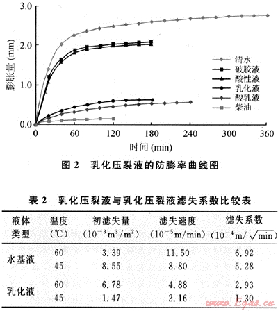 油基、泡沫和乳化壓裂液是目前對付強水敏地層壓裂改造的主要液體體系,因油基壓裂液在低溫下存在破膠困難和施工時的重大安全隱患,二氧化碳泡沫壓裂液要形成泡沫必須滿足一定的溫度條件,由于地層溫度低,在大部分裂縫中,壓裂液溫度小于CO2起泡溫度,不能形成泡沫,限制了它在儲層中的使用[2],而乳化壓裂液通過油相的乳化形成油水兩相降低濾失,同時大大減少了水相的用量,可以起到較好的防膨作用,安全隱患較油基小得多,因此選用乳化壓裂液體系作為強水敏地層的壓裂液體系。研究表明,油相:水相=1:1的乳化壓裂液體系防膨效率可以達(dá)到76.15%,較水基壓裂液提高50.0%,濾失系數(shù)降低60.0%~70.0%(見圖2、表2)。