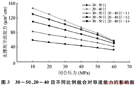 針對地應(yīng)力高、地層濾失大、裂縫寬度小的特點,通過室內(nèi)30~50目和20~40目陶粒組合導(dǎo)流能力實驗表明,30~50目和20~40目陶粒以1:4組合加入,不會顯著影響導(dǎo)流能力(導(dǎo)流能力降低小于10.0%),而可以以小粒徑陶粒填充窄裂縫,待形成一定寬度后再加入20~40目陶粒,可以提高施工成功率(圖3)。