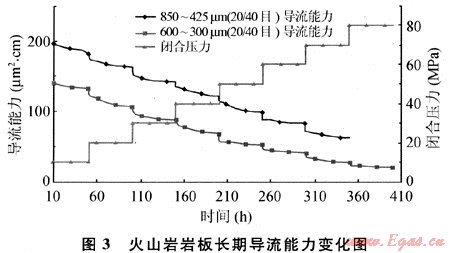 為了更接近于實際地下情況條件下進(jìn)行支撐劑導(dǎo)流能力實驗,考察支撐劑嵌入地層的影響,以便進(jìn)一步確定合理裂縫形態(tài),準(zhǔn)確預(yù)測氣井產(chǎn)量[4],實驗中首次采用了火山巖的巖板進(jìn)行導(dǎo)流能力實驗,實驗條件均考慮了地層溫度、地層鹽水的影響,實驗連續(xù)運轉(zhuǎn),實驗時間在300h以上,以便對比長期導(dǎo)流能力。