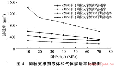 氣體導(dǎo)流實驗數(shù)據(jù)明顯高于液體介質(zhì)測定的導(dǎo)流能力數(shù)據(jù)(圖4),因此在可以使用小粒徑與常規(guī)粒徑的組合技術(shù)或根據(jù)情況全程采用小粒徑支撐劑技術(shù)進(jìn)行氣藏改造,而且不一定需要追求高砂液比施工,從而不但可滿足生產(chǎn)要求,而且可以避免施工砂堵風(fēng)險。