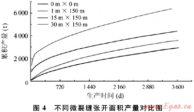 采用相同的輸入?yún)?shù),微裂縫張開面積分別假設(shè)為0m2、150m2(1m×150m,天然微裂縫張開范圍為裂縫長度方向150m,垂直裂縫方向1m,以下同),2250m2(15m×150m),4500m2(30m×150m),裂縫孔隙度為0.12%,微裂縫滲透率為800μm2。圖4給出了不同微裂縫張開面積下的累積產(chǎn)量隨時(shí)間的變化曲線。