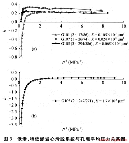 由此可知,低滲巖心氣體滲流過程中滑脫效應(yīng)并不是一定存在,而且滑脫系數(shù)也并不是一個(gè)常數(shù),在低孔隙壓力條件下,滑脫系數(shù)可以認(rèn)為是一個(gè)常數(shù),但是隨孔隙壓力增加,滑脫系數(shù)開始減??;而且滲透率越大,滑脫系數(shù)越小,滑脫效應(yīng)越不明顯;對(duì)于特低滲巖心,滑脫系數(shù)明顯偏大,而且在高孔隙壓力下滑脫系數(shù)雖有所減小,但是變化不是太大,一般不會(huì)變?yōu)樨?fù)值。說明氣體滑脫效應(yīng)確實(shí)主要發(fā)生在低孔隙壓力下的低滲透巖石中。較高滲透巖石中雖然也存在滑脫效應(yīng),但是隨壓力增加,滑脫效應(yīng)迅速減小直至可以忽略。