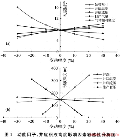 敏感性分析是分析各種不確定性因素變化到一定的幅度時(shí),對(duì)所關(guān)注指標(biāo)的影響程度,并把不確定性因素當(dāng)中對(duì)關(guān)注指標(biāo)影響程度較大的因素,稱之為敏感性因素[4~5]。由圖1可以看出動(dòng)能因子對(duì)生產(chǎn)油管的內(nèi)徑尺寸敏感性最強(qiáng),其次是日產(chǎn)氣量和井底流動(dòng)壓力,而氣體的相對(duì)密度和井底溫度的變化對(duì)動(dòng)能因子影響較小。由此我們可以得出結(jié)論:當(dāng)以目前的產(chǎn)量下不能完全攜液時(shí),及時(shí)地更換較小管徑的管柱生產(chǎn)能有效地提高氣井的攜液能力。當(dāng)氣井的流量下降到臨界流量以下后,氣井不能依靠自己的能量完全排出地層產(chǎn)出的液體,就會(huì)在井底出現(xiàn)不同程度的積液。由圖1可以看出積液高度對(duì)管鞋處的壓力、井口套壓極其敏感,所以要準(zhǔn)確判斷井底積液的高度,一定要取準(zhǔn)井口的生產(chǎn)套壓和井底管鞋處的流動(dòng)壓力,否則計(jì)算出的結(jié)果誤差較大。