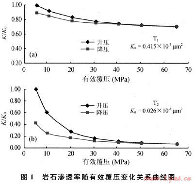圖1是采用CMS300測得的低滲透巖石滲透率與有效覆壓關(guān)系曲線。從圖1可看出:①巖樣初始滲透率(K0’越低,滲透率在有效覆壓增加的過程中的下降幅度越大;②滲透率在有效覆壓增大的初始階段下降幅度最大,覆壓降低后滲透率不能完全恢復(fù),說明巖樣在實驗過程中發(fā)生了微量的軟塑性變形。)