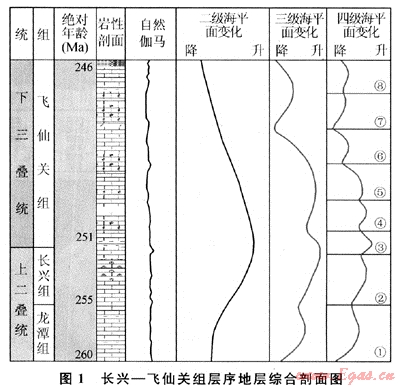 根據(jù)層序地層學(xué)的理論和方法,通過大量野外露頭、鉆井、測(cè)井與地震資料的詳細(xì)分析,認(rèn)為上二疊統(tǒng)龍?zhí)?吳家坪)-長興組、下三疊統(tǒng)飛仙關(guān)組地層可作為一個(gè)二級(jí)層序,時(shí)間間隔為14Ma[4~6]。二級(jí)層序由海侵體系域和高位體系域組成,缺失低位體系域,其中長興組為二級(jí)層序的海侵體系域,而飛仙關(guān)組為二級(jí)層序的高位體系域,長興組與飛仙關(guān)組的分界為最大海泛面(圖1)。上二疊統(tǒng)-下三疊統(tǒng)從下至上可進(jìn)一步劃分為4個(gè)三級(jí)層序和8個(gè)四級(jí)層序(即Ⅰ、Ⅱ、Ⅲ、Ⅳ、Ⅴ、Ⅵ、Ⅶ、Ⅷ層序),其中第Ⅰ層序的底界面為I型層序界面,其余7個(gè)四級(jí)層序的底界面均為Ⅱ型層序界面。故除第1層序包括一個(gè)低位體系域、一個(gè)海侵體系域和一個(gè)高水位體系域外,其他四級(jí)層序的臺(tái)地邊緣體系域不發(fā)育,每一個(gè)層序包括一個(gè)海侵體系域和一個(gè)高水位體系域,共計(jì)17個(gè)體系域。