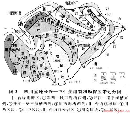 Ⅰ.臺(tái)緣礁灘區(qū):主要發(fā)育于環(huán)開江-梁平海槽、城口 鄂西海槽及川西海槽的臺(tái)緣礁灘疊合區(qū)(圖3),縱向上發(fā)育于第Ⅱ?qū)有蚋呶惑w系域、第Ⅲ層序海侵體系域的臺(tái)緣礁白云巖和第Ⅵ層序的臺(tái)緣鮞灘中,礁灘自云石化作用和溶蝕作用都較發(fā)育;主要儲(chǔ)集空間為溶蝕孔,白云石晶間孔,孔隙系統(tǒng)發(fā)育,儲(chǔ)集性能好。其中:①鄂西-城口海槽西側(cè),礁灘儲(chǔ)層發(fā)育,勘探潛力巨大,目前中國石油天然氣集團(tuán)公司已經(jīng)部署了專層井正待上鉆,成功與否,都有非常大的意義;②開江-梁平海槽東側(cè)和開江-梁平海槽西側(cè)已經(jīng)發(fā)現(xiàn)10余個(gè)礁灘氣藏,是目前四川盆地勘探的熱點(diǎn)更是重點(diǎn)地區(qū);③川西海槽兩側(cè):如若“川西海槽”找到更為充分的證據(jù)并得到證實(shí),將為四川盆地長興-飛仙關(guān)組的勘探帶來一片新的天地。