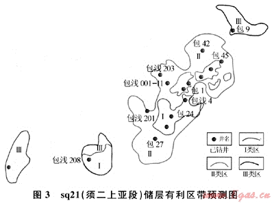 在對sq21(須二上亞段)進(jìn)行儲層分類評價(jià)時(shí),以儲能系數(shù)大于1、0.5~1、小于0.5分布作為Ⅰ、Ⅱ、Ⅲ儲層的分類依據(jù),以區(qū)塊內(nèi)是否有獲得工業(yè)油氣流井作為分類的劃分標(biāo)準(zhǔn)。Ⅰ類有利區(qū)位于鼻狀構(gòu)造上,儲層發(fā)育好,儲能系數(shù)大于1,且有工業(yè)氣流井;Ⅱ類有利區(qū)位于鼻狀構(gòu)造上,儲層發(fā)育較好,儲能系數(shù)為0.5~1,且有工業(yè)氣流井;Ⅲ類有利區(qū)位于鼻狀構(gòu)造之外,但儲層較發(fā)育,儲能系數(shù)在0.5~1。綜合評價(jià)出Ⅰ類有利區(qū)4個(gè),Ⅱ類有利區(qū)2個(gè),Ⅲ類有利區(qū)3個(gè)。Ⅰ類有利區(qū)塊位子包22井-包24井-包淺4井區(qū)、包21-包1-包淺001-6井區(qū)、包33井-包16井-包45井井區(qū)、包淺208井區(qū);Ⅱ類較有利區(qū)塊位于包淺201-包27井區(qū)、包淺203-包淺001-11井區(qū)、包42井區(qū)(圖3)。