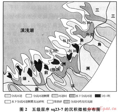 確定重點(diǎn)五級層序,進(jìn)行儲層精細(xì)刻畫,對sq13-6、sq21-4、sq21-6、sq23-3、sq23-7、sq31-4、sq31-7、sq33-2、sq33-7等9個(gè)重點(diǎn)含氣的五級層序進(jìn)行了儲層的精細(xì)刻畫。以五級層序sq23-7為例(圖2),其沉積沉積物源主要來自工區(qū)南部及東南部方向,區(qū)內(nèi)發(fā)育三角洲平原水上分流河道、河道間洼地,三角洲前緣水下分流河道、河口壩、遠(yuǎn)砂壩及席狀砂等沉積微相,并可精細(xì)刻畫出河道主體與河道側(cè)翼。河包場氣田主要處于水下分流河道、河口壩砂體主體發(fā)育帶。分流河道砂巖厚度在10m以上;河口壩砂巖厚度為8~10m,其發(fā)育位置包括包淺207-包淺205井區(qū)、包淺201井區(qū)、包4井區(qū)、包46井區(qū)等。遠(yuǎn)砂壩的砂巖厚度一般為2~4m,分布在河口壩前端,由于受湖水的改造而形成的席狀砂呈帶狀分布,二者呈過渡關(guān)系,不易區(qū)分。