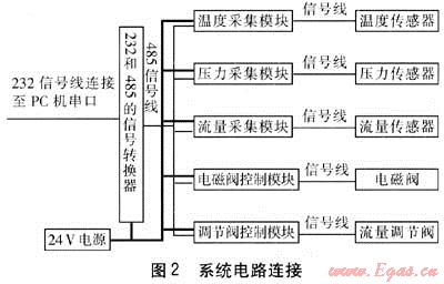 電路設(shè)計(jì)要根據(jù)測(cè)試系統(tǒng)中所選用的儀器儀表來進(jìn)行。溫度測(cè)量采用德國(guó)原產(chǎn)溫度傳感器與變送器,Pt100精度等級(jí)1/3B,4線制;溫度測(cè)量范圍為0~150℃,具有響應(yīng)時(shí)間短、測(cè)量精度高等特點(diǎn),輸出信號(hào)4~20mA。流量測(cè)量采用德國(guó)原產(chǎn)ProcessMaster系列電磁流量計(jì)、五點(diǎn)標(biāo)定后精度為0.2%。電磁流量計(jì)根據(jù)法拉第電磁感應(yīng)定律設(shè)計(jì),流量正比于介質(zhì)流速和磁通密度,以及電極間的距離。電壓信號(hào)用變送器轉(zhuǎn)換成標(biāo)準(zhǔn)信號(hào),方便數(shù)據(jù)采集,而且電磁流量計(jì)無節(jié)流部件,壓力損失小,減少能耗,只與被測(cè)流體的平均速度有關(guān),測(cè)量范圍寬。只需經(jīng)水標(biāo)定后即可測(cè)量其他介質(zhì),無須修正,相比于浮子流量計(jì)精度大大提高。壓力測(cè)量采用德國(guó)原產(chǎn)壓力傳感器,測(cè)壓范圍為0~3MPa,精度為0.15%,輸出標(biāo)準(zhǔn)電流信號(hào)。燃?xì)庀牧繙y(cè)量采用日本品川濕式氣體流量計(jì),既可以通過流量計(jì)的機(jī)械表盤讀取燃?xì)庀牧?,也可以通過其發(fā)出的電信號(hào)經(jīng)過處理后得到燃?xì)庀牧俊H細(xì)鈮毫y(cè)量用壓力表量程為0~5kPa,輸出相應(yīng)的電信號(hào)進(jìn)行數(shù)據(jù)采集。流量調(diào)節(jié)閥選用電動(dòng)調(diào)節(jié)閥,進(jìn)行遠(yuǎn)程控制。煙氣分析儀采用多組分煙氣分析儀,各組分都有對(duì)應(yīng)的電信號(hào)輸出。數(shù)據(jù)采集模塊選用ADAM系列模塊對(duì)各參數(shù)進(jìn)行高精度采集與控制。系統(tǒng)電路連接見圖2。