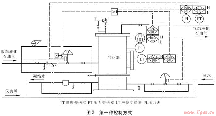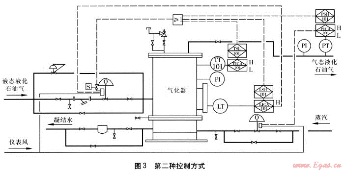 氣化器的控制方式比較靈活,實(shí)際生產(chǎn)中往往要根據(jù)現(xiàn)場(chǎng)的工況、氣化量、用途及性?xún)r(jià)比等因素綜合考慮,總之,系統(tǒng)要具有較強(qiáng)的抗干擾能力,應(yīng)易于擴(kuò)展,對(duì)于安全性要求較高的場(chǎng)合應(yīng)本著滿(mǎn)足故障安全的設(shè)計(jì)原則。本文討論2種控制方式,分別見(jiàn)圖2和圖3。圖3的圖例同圖2。
