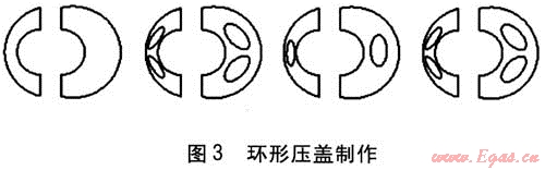 ⑥ 將2塊半環(huán)形的鋼板扣合在燃?xì)夤艿郎?,焊接?塊環(huán)形柱狀體,即環(huán)形壓蓋。